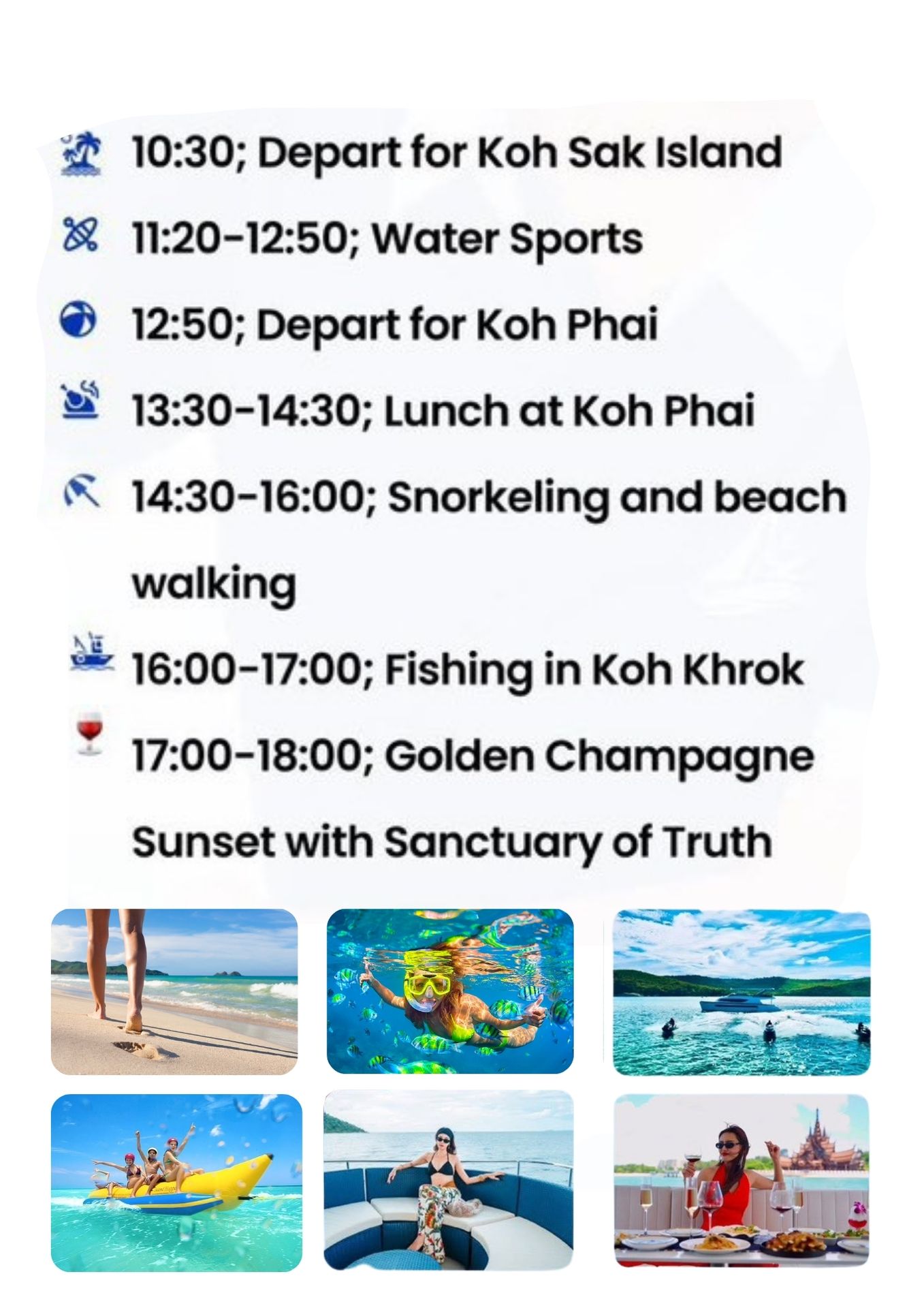 Start your journey with a cruise to Koh Sak Island. Dive into water sports, swimming, and pure fun on the open sea – the perfect way to kick off your day.